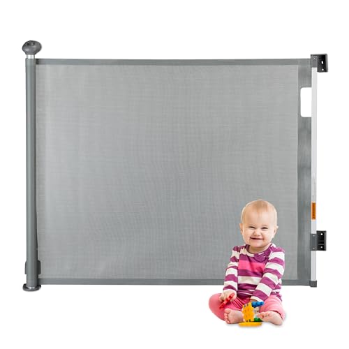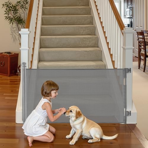 VEVOR Barrière de Sécurité Extensible Jusqu’à 140 cm Hauteur 87 cm, Barrière Rétractable pour Animaux de Compagnie, Clôtures en Mailles, pour Chiens Couloir Escalier Porte Salle de Jeux, Gris