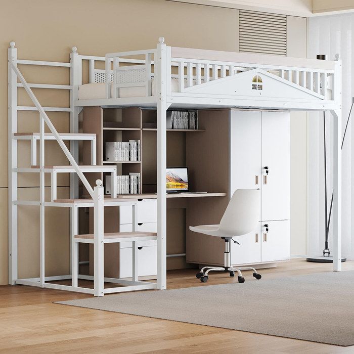 Lit superposé avec toboggan 90x200cm, en bois de pin+mdf, barrière de sécurité, fenêtre, toit, blanc