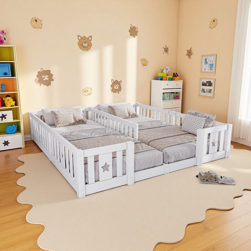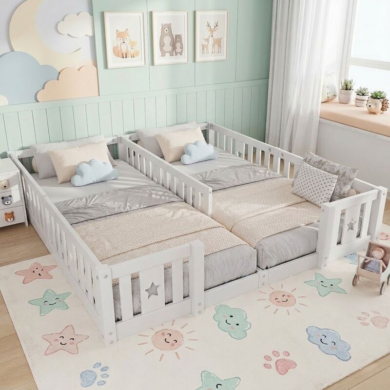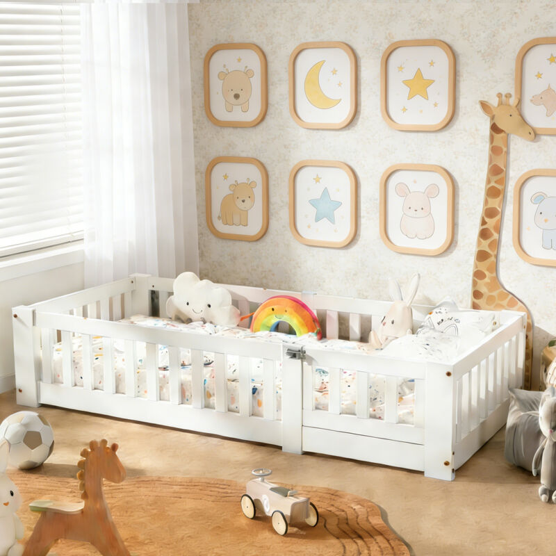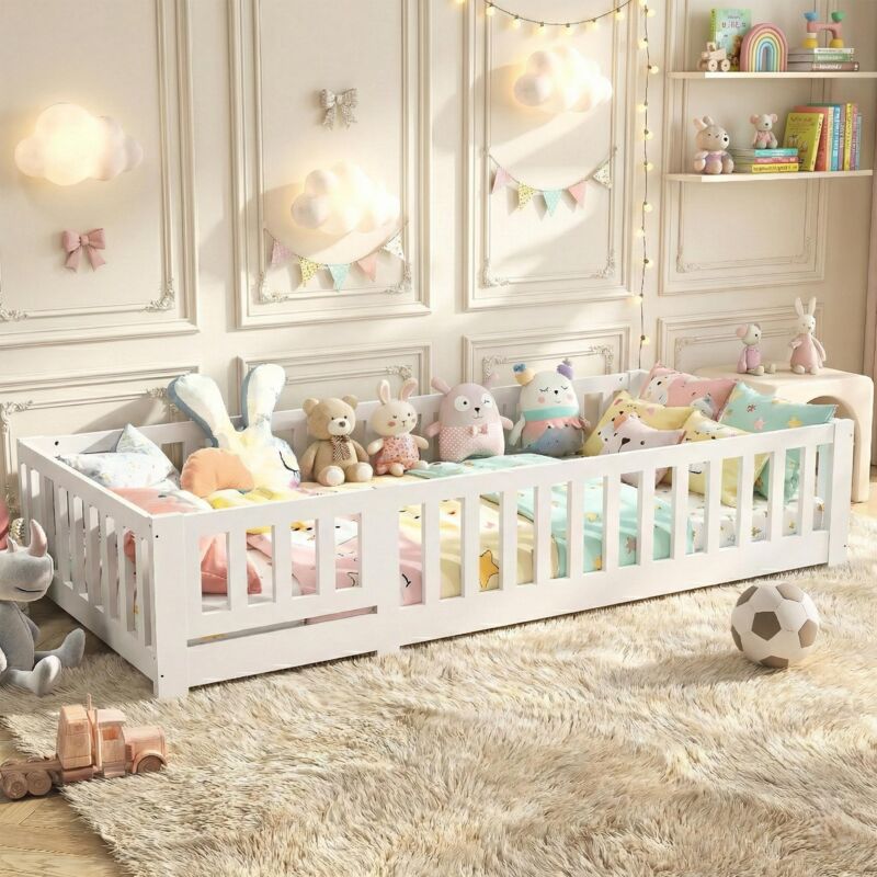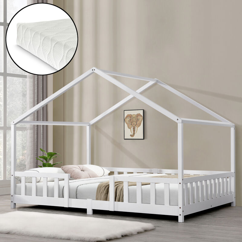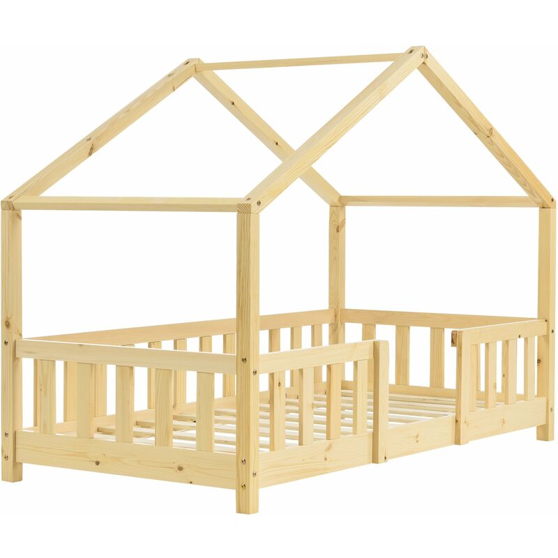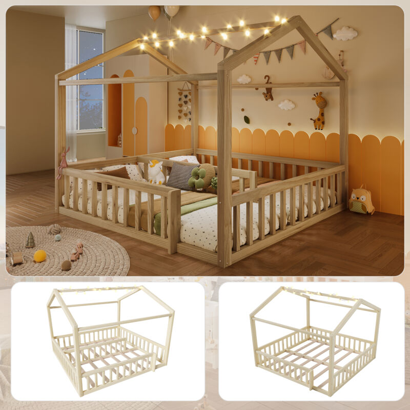 Lit combine enfant 90x190, barrière de sécurité lit cabane enfant, structure bois massif, perles led
