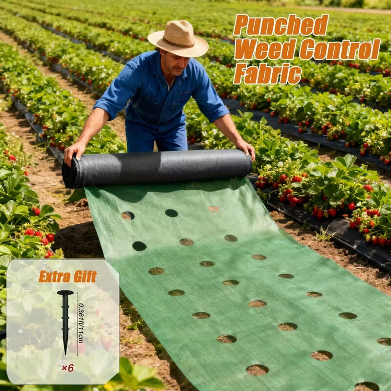 Gdfnmogo Film de paillage perforé pour jardin potager - Film barrière agricole en polyéthylène noir - 95 cm de largeur x 10 m de long - 5 trous à 15 cm d'espacement - 45 mm de diamètre
