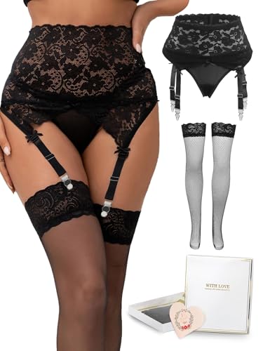 ohyeahlady Porte Jarretelle Femme Sexy Ensemble Grande Taille Bas Resille et Porte Jarretelle Bas Autofixant Guepiere Tenu Hot Sous Vetement Lingerie Dentelle 3XL-4XL,Noir+Bas