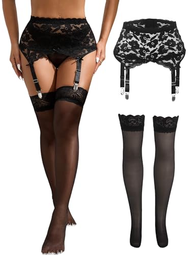 ohyeahlady Porte Jarretelle Femme Sexy Ensemble Grande Taille Bas Resille et Porte Jarretelle Bas Autofixant Guepiere Tenu Hot Sous Vetement Lingerie Dentelle XS-S,Noir+Bas