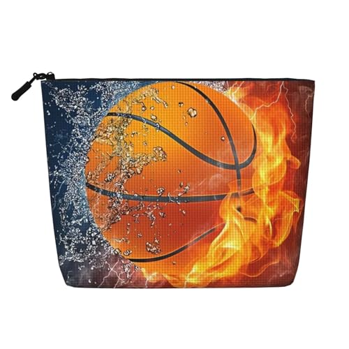 Trousse de maquillage pour femme avec motif de basket-ball sur le feu et l'eau - Grande capacité - En cuir synthétique - Fermeture éclair - Portable - Large ouverture - Blanc - Taille unique