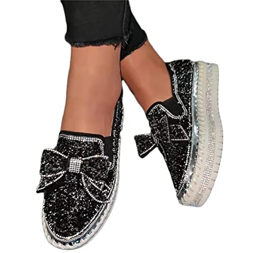 Minetom Femme Slip-on Sneakers Tennis Basket Glitter Chaussures Strass Nœud Papillon Flat Loafers Paillettes Mocassins Plats B Noir 41 EU