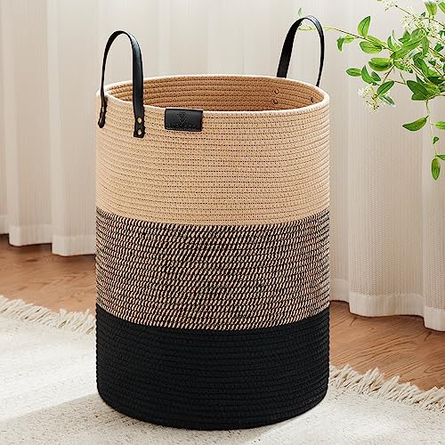 VIPOSCO Tall Laundry Basket, Large Dirty Clothes Hamper with Leather Handle, Woven Rope Storage Basket for Blanket, Toy In Living Room, Bathroom, Bedroom - 100L Brown & Black