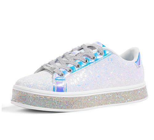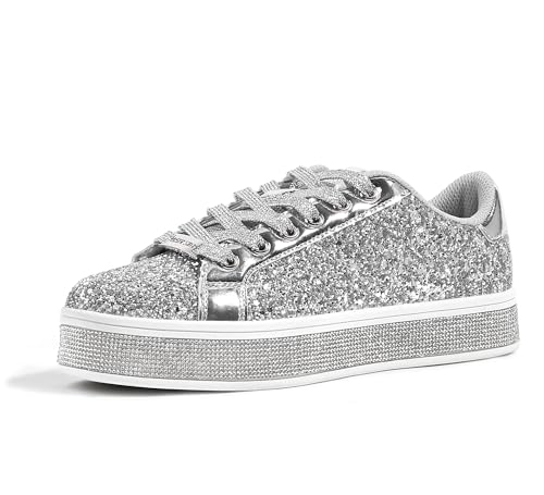 LUCKY STEP Baskets à Plateforme Scintillante pour Femme,fête de Mariage et Marche (Argent avec Strass, 8.5US-39EU-6UK)