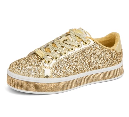 LUCKY STEP Baskets à Plateforme Scintillante pour Femme,fête de Mariage et Marche (Or avec Strass, 8.5US-39EU-6UK)