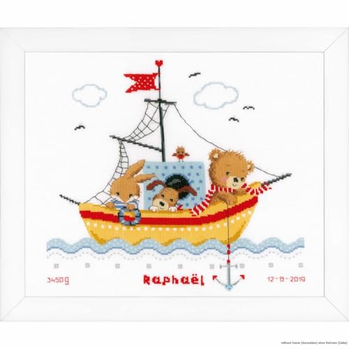 VERVACO Point De Croix Compté DIY Cadeau Bebe Naissance Personnalisé Bateau À Voile Tableau Complet Kit De Broderie Loisir Créatif Maison Décoration ca. 36 x 33 cm Cross Stitch, Cotton, Multicolore