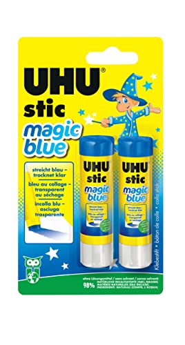 UHU Stic - Bâton de Colle Sans Solvants Magic Blue - Colle Enfant, Dès 3 Ans - Loisirs Créatifs - Bleue au Collage/Transparente Une Fois Sèche - Lot de 2 Stics de 8,2 g