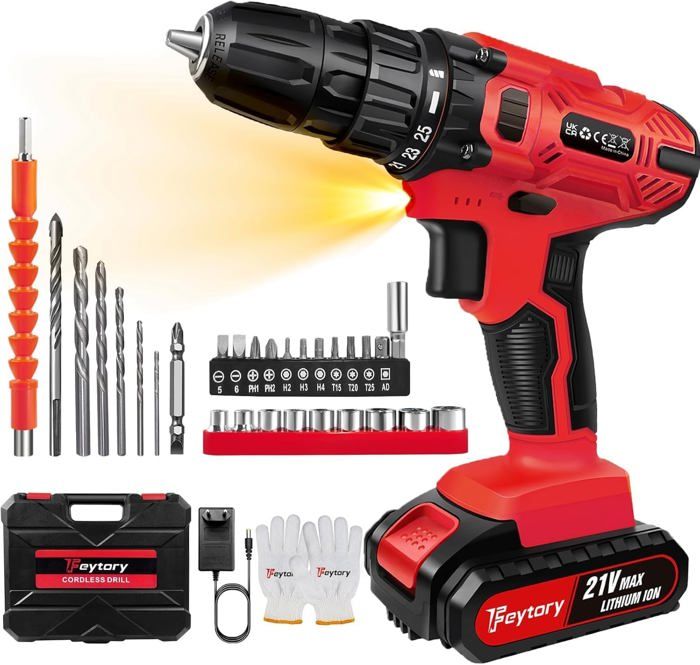 Perceuse Visseuse Sans Fil 21VFeytory Perceuse Percussion avec Batterie 15Ah 45N.m Couple Max 2 Vitesses 29 Accessoires LED