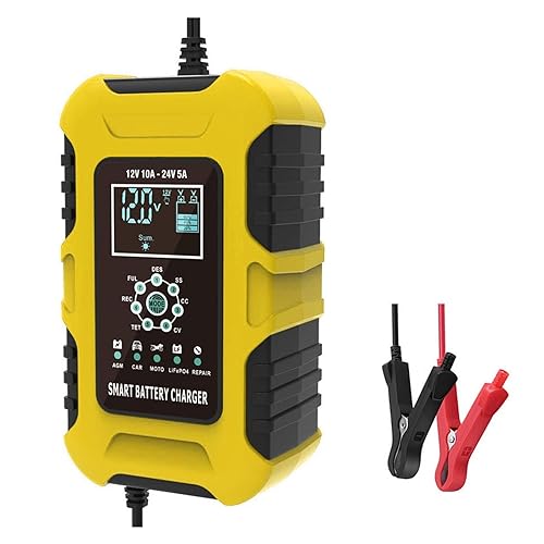 Chargeur De Batterie Automatique À 7 Étages 12V 10A 24V 5A Voiture for Camion Moto Lithium LiFePO4 Affichage LCD Au Plomb Chargement Rapide Puissant(Yellow)