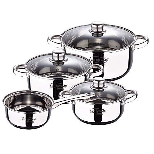 San Ignacio Batterie 7 pièces en acier inoxydable : casserole Ø16 x 7,5 cm avec couvercle de Ø18 x 8,5 Ø 20 x 9,5 et Ø24 x 11,5 cm, induction, collection Cassel, 7 pièces