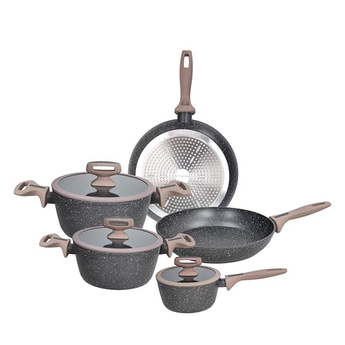 BAKAJI Batterie de casseroles et poêles 21 pièces à induction et gaz, kit adapté à tous les plans de cuisson, antiadhésif en aluminium moulé sous pression et effet en granit avec couvercle et