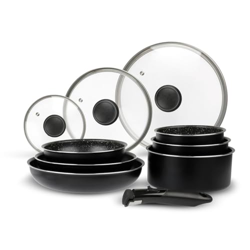Sitram 713496 Batterie de cuisine 7 pcs Aluminium noir : manche amovible, 3 Poêles Ø20,24,28 cm, 3 Casseroles Ø16,18,20 cm - Revêtement anti-adhérent sans PFOA effet Pierre - Tous feux dont induction