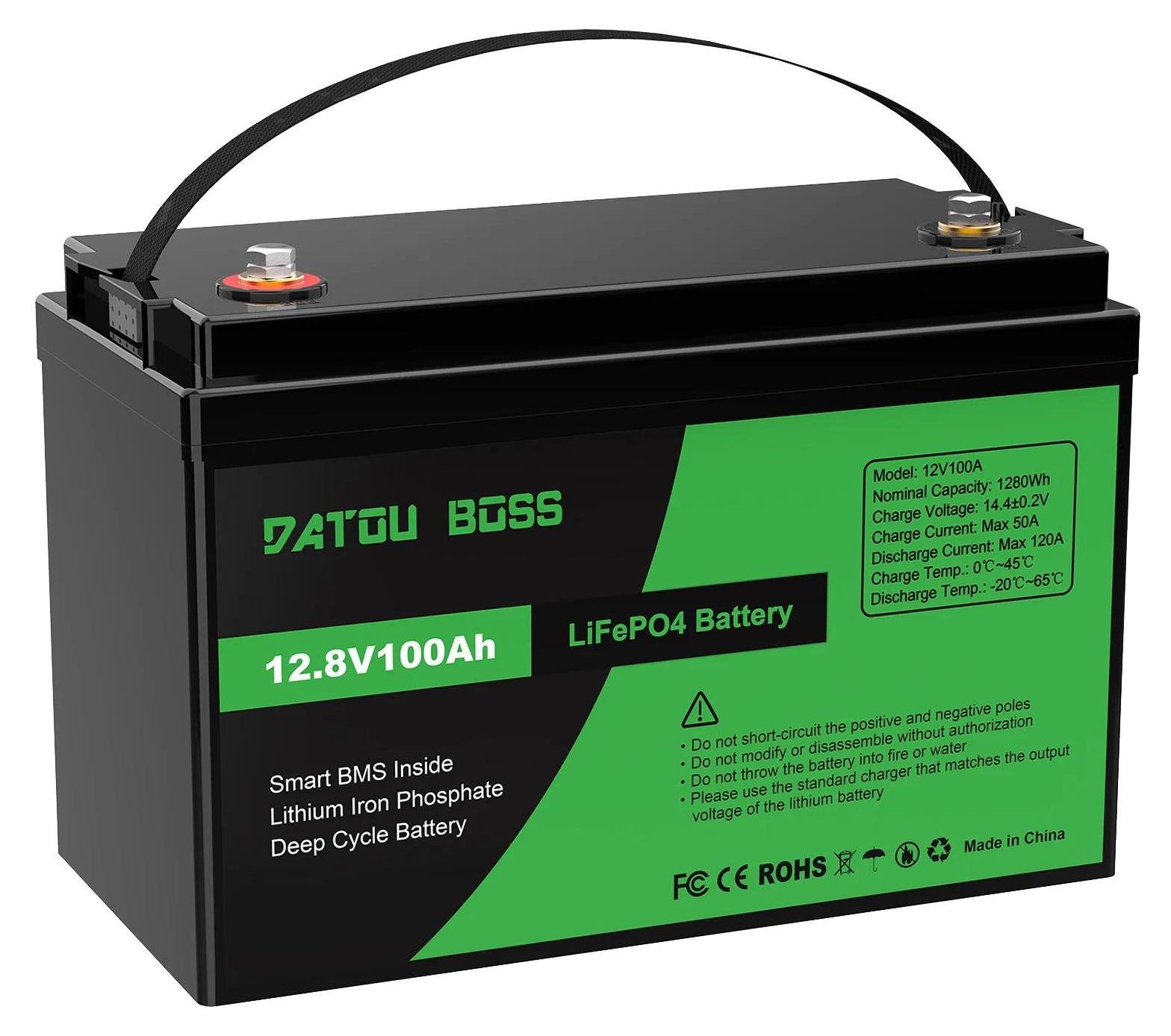 Batterie LiFePO4 - 12,8 V, 100 Ah, cycle profond - BMS intégré - Décharge continue 100 A - Courant de pointe 200 A pendant 1 s - Pour installations solaires, camping-cars - Vert