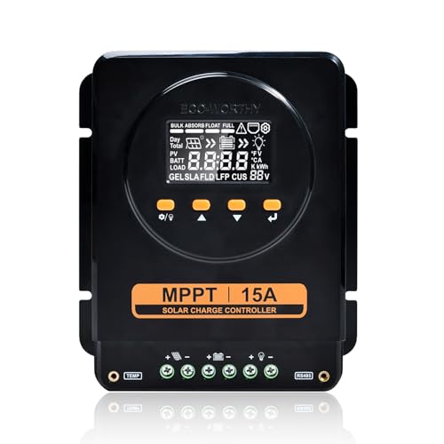 ECO-WORTHY Régulateur de charge solaire MPPT 15 A, 12 V/24 V, avec écran LCD, moniteur d'application Bluetooth et RS485, 99 % d'efficacité de charge pour batterie au lithium GEL SLA FLD