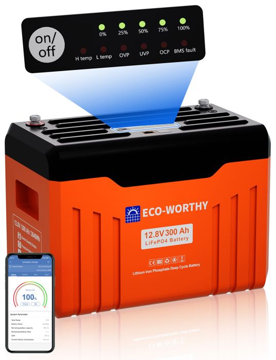 ECO-WORTHY Batterie Lithium 12V 300Ah LiFePO4 Bluetooth avec écran, Batterie lifepo4 avec 200A BMS Protection Basse température et Max. 15000 Cycles,3840Wh 12V pour Camping-Car,Panneau Solaire