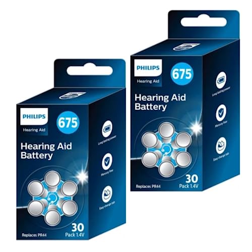 PHILIPS Lot de 60 Piles 1,4 V pour appareils auditifs 675 (Hearing Aid Battery) ZA675B6A/00, Technologie Premium Zinc Air, Batterie Longue durée, Languette d'ouverture Facile, Type PR44 et ZA675, 60