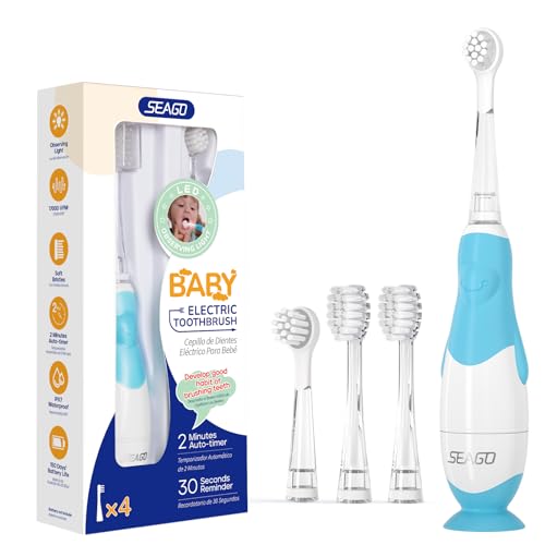 Seago Brosse à Dents électrique pour Enfants de 6 mois à 4 ans,étanche, Minuterie Intelligente,Lampes à LED de Couleur et 4 têtes de Brosse,Batterie Brosse à Dents Pour Bébé à Piles SG513,Bleu