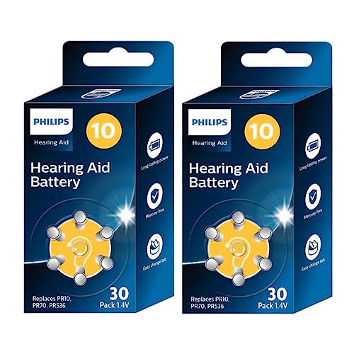 PHILIPS Lot de 60 Piles 1,4 V pour appareils auditifs 10 (Hearing Aid Battery) ZA10BX30/00, Technologie Premium Zinc Air, Batterie Longue durée, Ouverture Facile, Type PR10, 70 et 536 (60 unités)