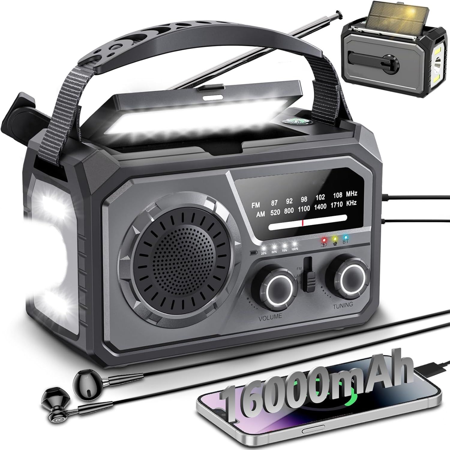 Radio à manivelle 16000 mAh avec Fonction de Charge de téléphone Portable, Solaire, AM/FM, Portable, avec Batterie Externe Rechargeable, Dynamo, Lampe de Poche, Alarme SOS, Boussole