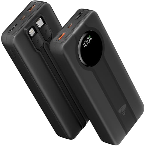 VRURC Batterie Externe 20000mAh avec 4 Câbles Intégrés Mini Power Bank USB C 22.5W Charge Rapide Batterie Portable avec Affichage LED pour iPhone Huawei Xiaomi