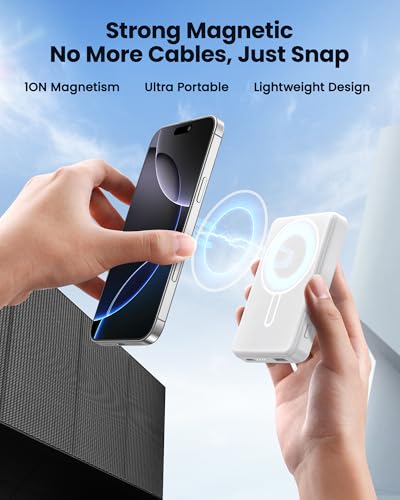 JUOVI Batterie Externe pour MagSafe Magnétique sans Fil 5000mAh Mini Power Bank Induction Ultra Fine Charge Rapide PD20W avec Câble USB-C Compatible avec Airpods i-Watch iPhone16 15 (Blanc, 20W)