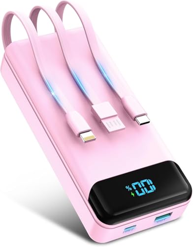 VRURC Batterie Externe 20000mAh avec 4 Câbles Intégrés Mini Power Bank USB C 22.5W Charge Rapide Batterie Portable avec Affichage LED pour iPhone Samsung Huawei Xiaomi (Rose)