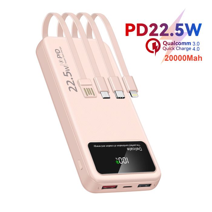 Batterie Externe Rose 20000mAh - Power Bank Mince - 4 Câbles Intégrés 6 Sorties 3 Entrées - Affichage LED - Compacte - Portable