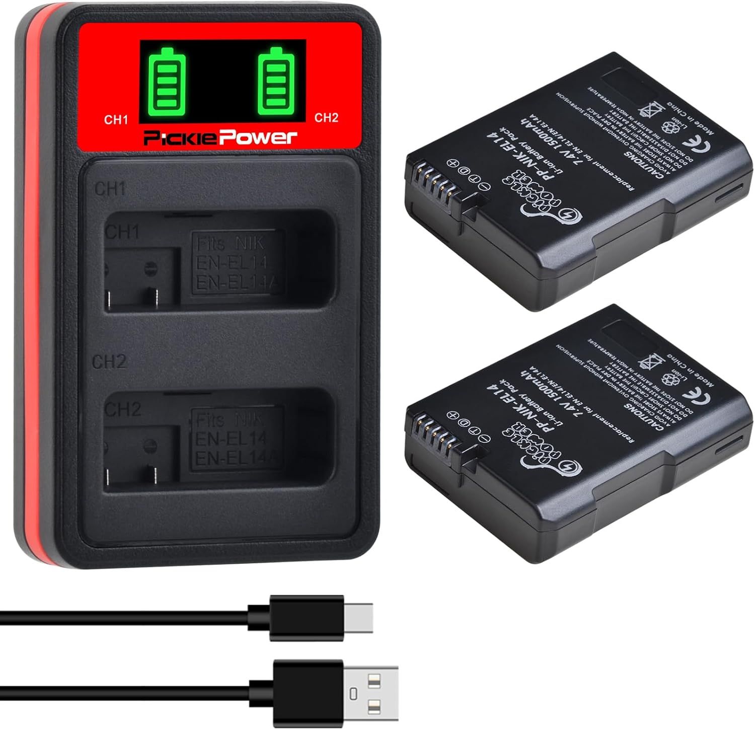 Pickle Power 2X1500mAh EN-EL14/EL14a Batterie et Chargeur LED pour Nikon D5600 D5500 D5200 D5100 D3500 D3400 D3300 D3200 D3100 Coolpix P7800 P7700 P7000 P7200