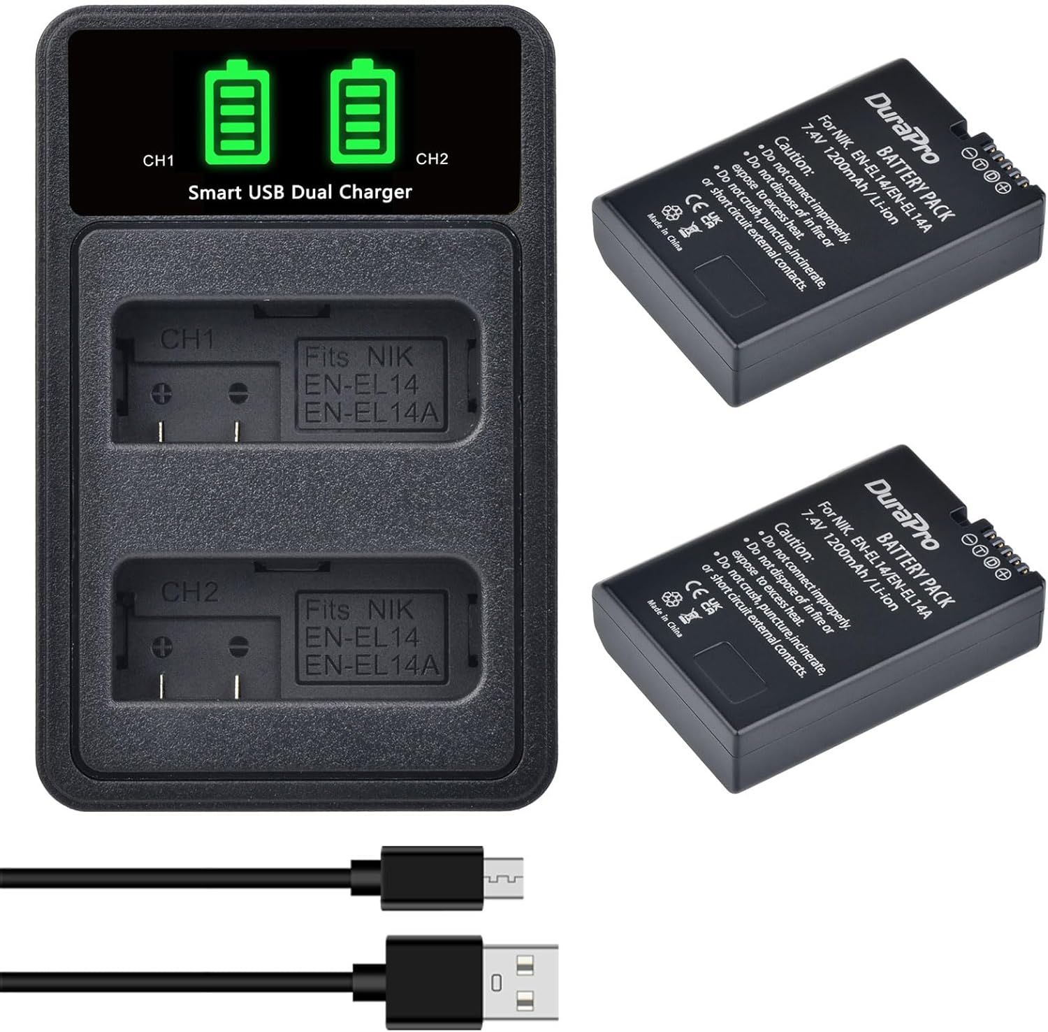 Batterie DuraPro 2Packs 1200mAh EN-EL14 EL14A + Chargeur Double LED pour Nikon EN-EL14 EN-EL14a; P7800 7700 7100 7000 D5600 D5500 D5300 D5200 D5100 Série 3000 D3400 D3300 D3200 D3100 Appareils Photo