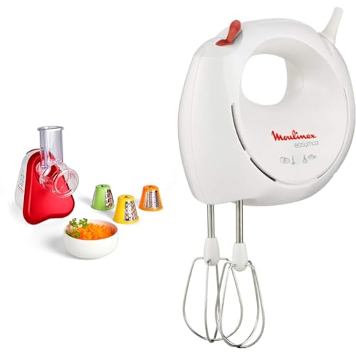 Moulinex Découpe-légumes électriqueFresh Express rouge, Râpe 3-en-1, Large goulotte, DJ753510 + Moulinex Batteur électrique Easymax blanc, 200 W, 2 vitesses, 2 jeux de fouets inclus, ABM11A30