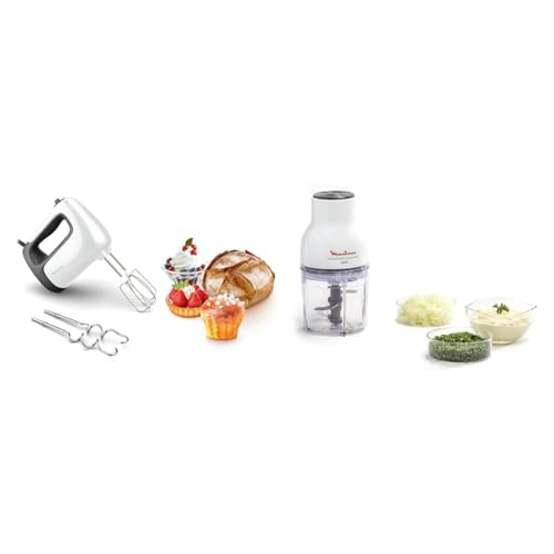 Moulinex Batteur électrique, 500 W, 5 vitesses, Réglage Turbo, 2 fouets + 2 pétrins & Hachoir électrique, 400 ml, 300 W, 4 lames, Fonctions 3-en-1, Emince, Hache, Mixe
