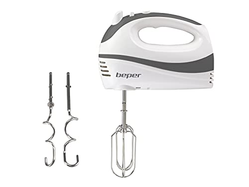 BEPER P102SBA100 Batteur à main électrique, Batteur pour fouetter les œufs, Pétrir et mélanger les crèmes et les sucreries, 2 Fouets 2 Crochets pétrisseurs inclus, 300 watts, Blanc/Gris