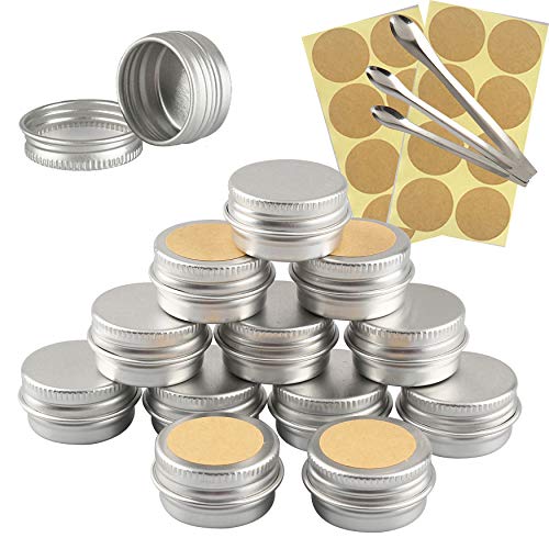 TIANZD 10 Pièces 5 ml Vide Rond Argent Pots en Aluminium Cosmétiques Pot Canettes Bocaux Conteneurs 5ml for Fait Main Bougies Crème Baume Voyage, 3x aluminium cuillère, 10x Étiquettes