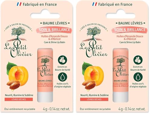 LE PETIT OLIVIER - Baume Lèvres Soin & Brillance - Huile D'Amande Douce et Abricot - Nourrit, Illumine & Sublime - Lèvres Sèches - Huiles 100% Végétales & Beurre de Karité - Fabriqué en France - 4 g