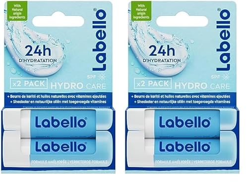 LABELLO Duo Hydro-Care (2 x 5,5 ml), Baume à lèvres FPS 15 hydratation longue durée pendant 24H, Soin des lèvres enrichi en huiles naturelles et au beurre de karité (Lot de 2)