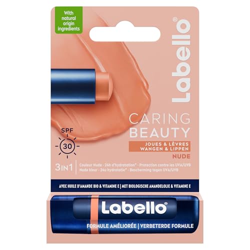 LABELLO Caring Beauty Nude FPS 30 (1 x 5,5 ml), Stick à lèvres au beurre de karité et huile d’amande, Baume à lèvres à la couleur neutre pour 24 H d’hydratation