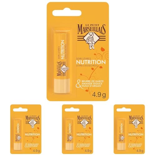 Le Petit Marseillais | Soin Lèvres Nutrition Lèvres Desséchées (tube de 4,9 g) – Baume à lèvres au beurre de karité, amande douce et huile d'argan – Stick à lèvres nourrissant (Lot de 4)