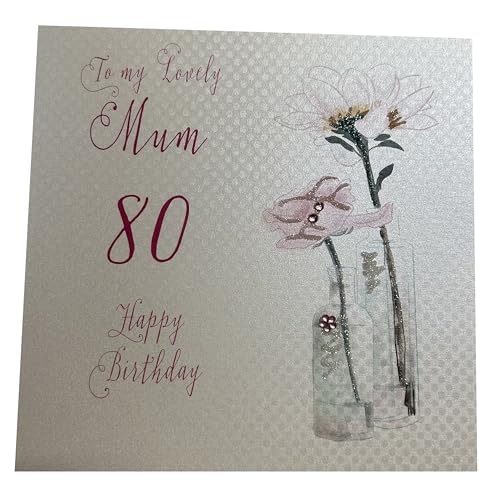 WHITE COTTON CARDS bd61-80 Carte d'anniversaire Faite Main pour 80e Anniversaire Motif Pissenlit et Phrase en Anglais Happy Birthday to a Lovely Mum 80 Blanc
