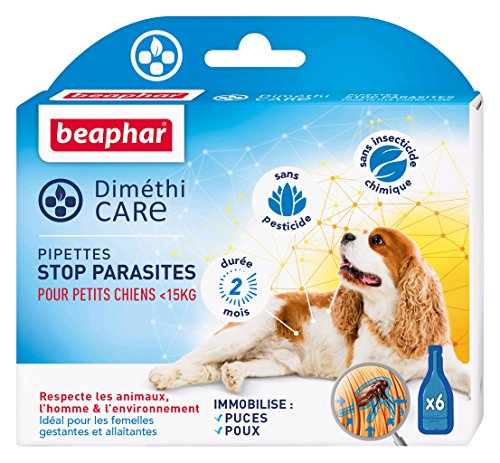 BEAPHAR – DIMÉTHICARE – Pipettes stop parasites pour petit chien <15kg – Contre puces, tiques et poux – Sans pesticide et sans insecticide chimique – Enrichie à l'Aloe Vera – Durée 2 mois – 6 pipettes