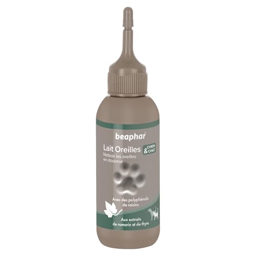 BEAPHAR – Lait nettoyant premium pour les oreilles du chien et du chat – Aux polyphénols de raisin, aux extraits de Romarin & de Thym – Nettoie en douceur les oreilles & élimine les impuretés – 125 ml