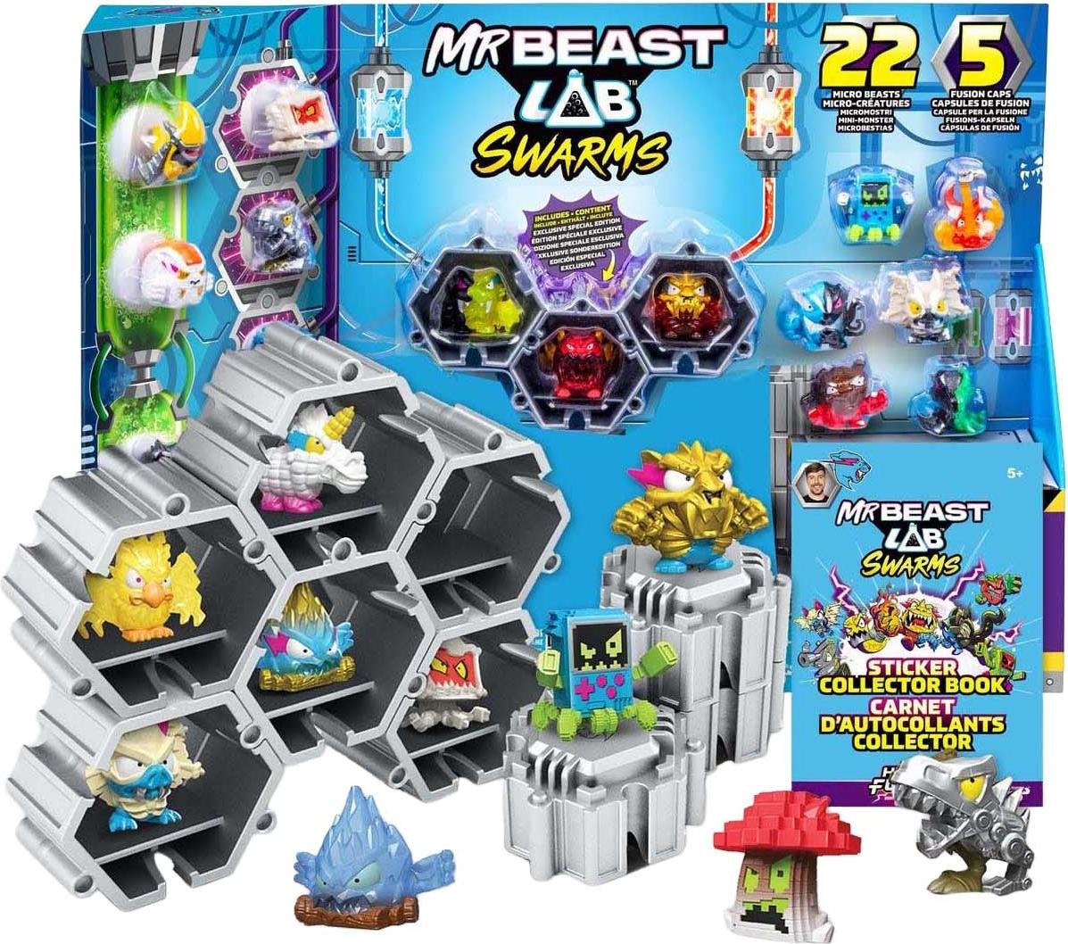 MrBeast Coffret Essaim de Collection, Peut contenir + de 70 Micro-créatures, 26 Micro-créatures Dont 2 phosphorescentes, 26 Autocollants et 2 Capsules de Fusion pour créer Ton Propre labo MrBeast