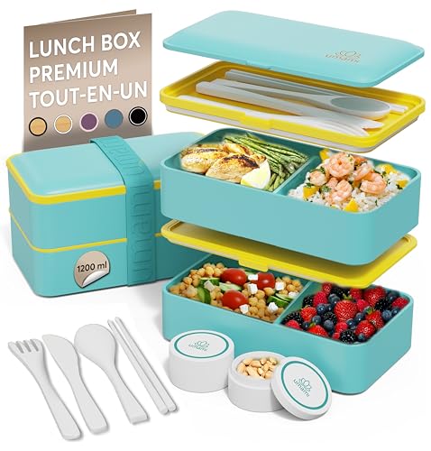 Umami Bento Lunch Box, Couverts & 2 Pots à Sauce Inclus, Boîte à Lunch Étanche, Lunchbox Adulte, Micro-Ondable, Boîte Repas Compartimentée, Turquoise Frais, 1200 ml
