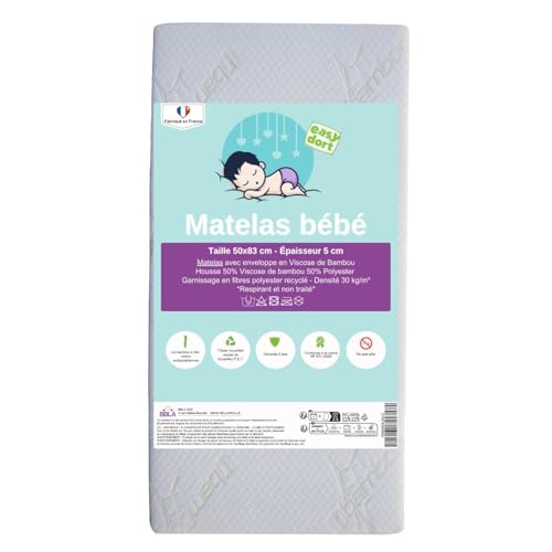 Easy Dort Matelas bébé 50x83 cm | Berceau ou lit bébé | Fabriqué en France | Été & Hiver | Double Face | Très Confortable | Housse en Bambou | Blanc |