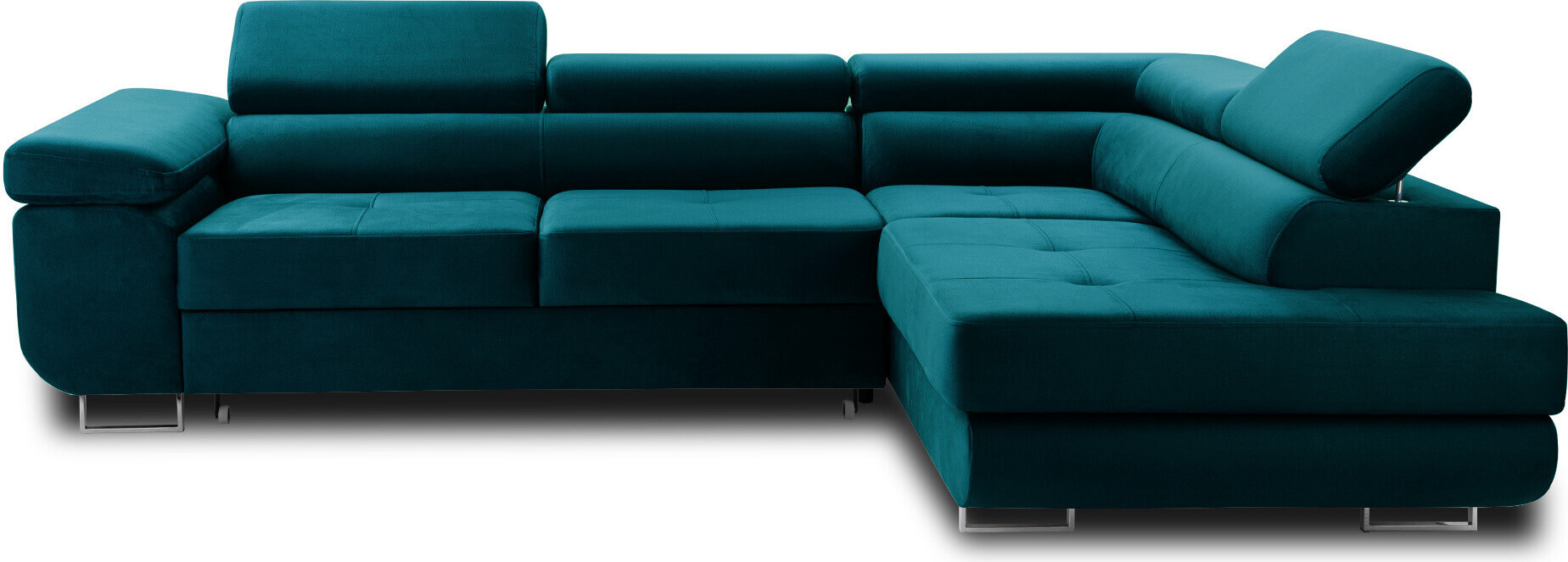 Best Mobilier Pablo - canapé d'angle droit - 5 places - convertible avec coffre et têtières réglables - en velours , Bleu canard