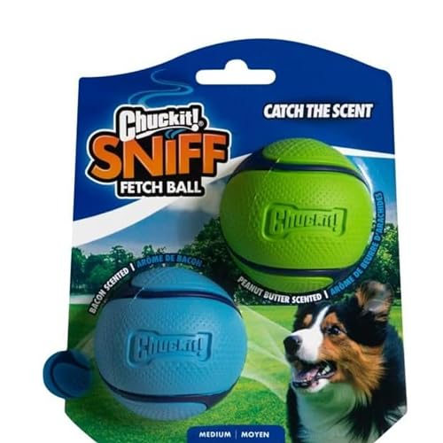 Chuckit! – Sniff Fetch Ball Duo – 2 Balles à Poursuivre pour Chien – 2 Balles au Parfum de Bacon et de Beurre de Cacahuète – Compatible avec Les Lanceurs Taille Medium – Diamètre de 6,5 cm