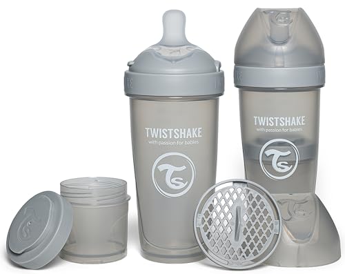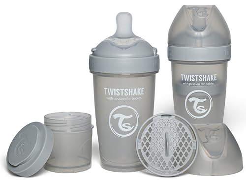 Twistshake Biberon Anti-Colique 330 ml avec Récipient à Lait en Poudre et Mélangeur – Tétine en Silicone Débit Rapide – Sans BPA – Idéal pour Bébé dès 4 Mois – Gris
