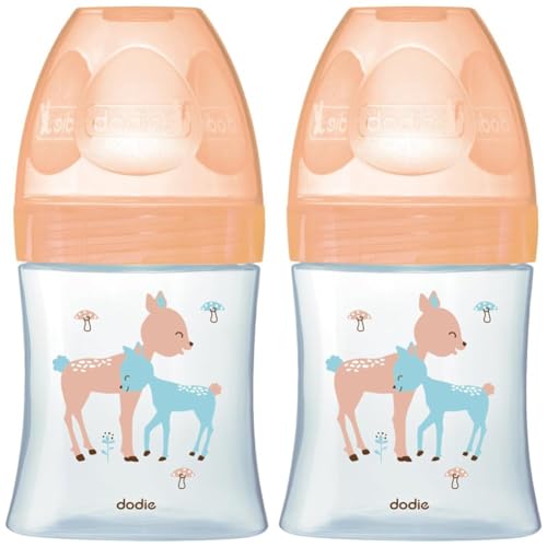 Dodie - Biberon Anti-Colique Sensation+ Verre, BEIGE BICHE, 150ml, 0-6 mois, Tétine plate, Débit 1 (Lot de 2)