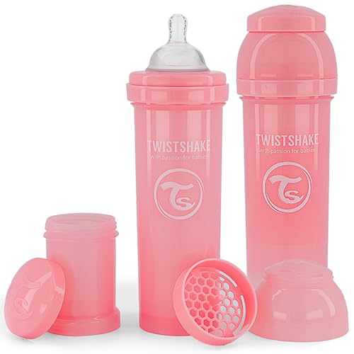 Twistshake Biberon Anti-Colique Avec Récipient Pour Lait En Poudre Et Mélangeur - 2x 330ml | Tétine En Silicone À Écoulement Rapide | Biberon Sans BPA | 4+ Mois | Rose